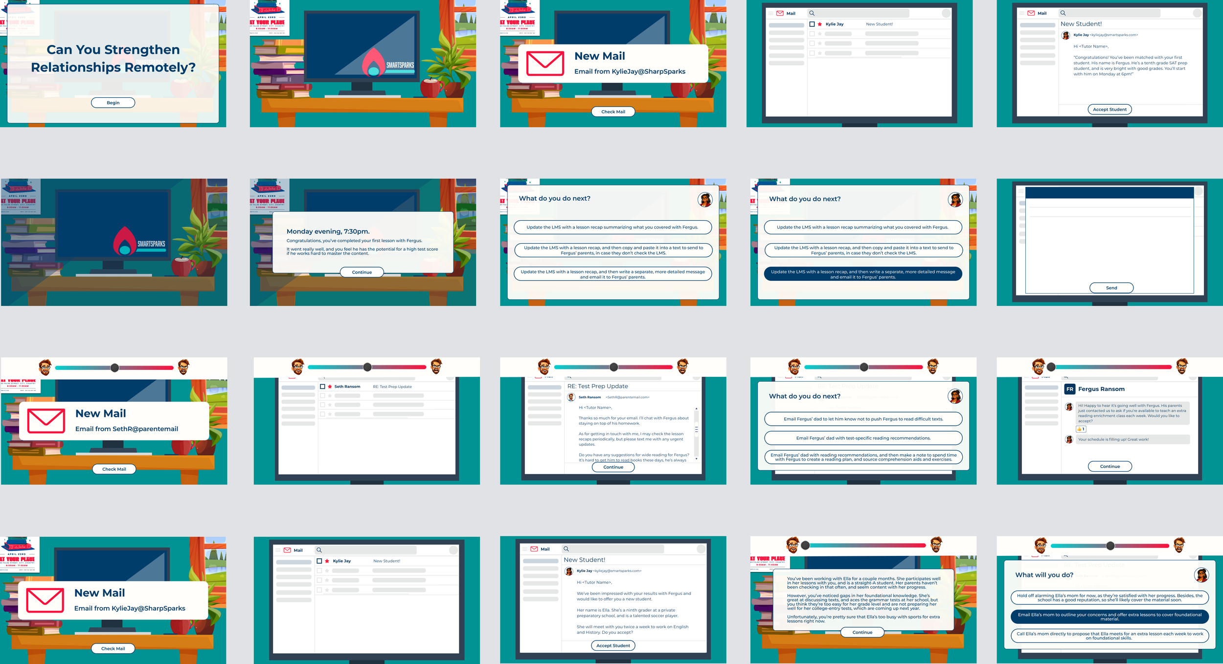 I designed this scenario-based eLearning concept project for new hires at a distance education company to strengthen client relationships in remote settings.