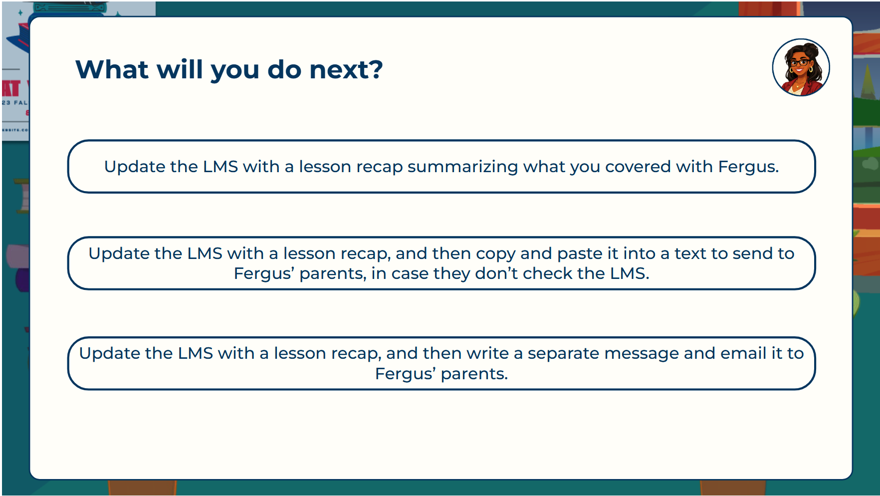Once the action map was completed and approved, I wrote a text-based storyboard to turn the key actions into a cohesive narrative with realistic, branching scenarios and consequences. The scenarios gave the learner risk-free opportunities to learn from common mistakes. While there were many real-life examples to choose from, I chose to focus on scenarios that take place in the most critical period of the client’s journey with the company — the initial lesson and the first couple months of an engagement — in which trust is first established.
